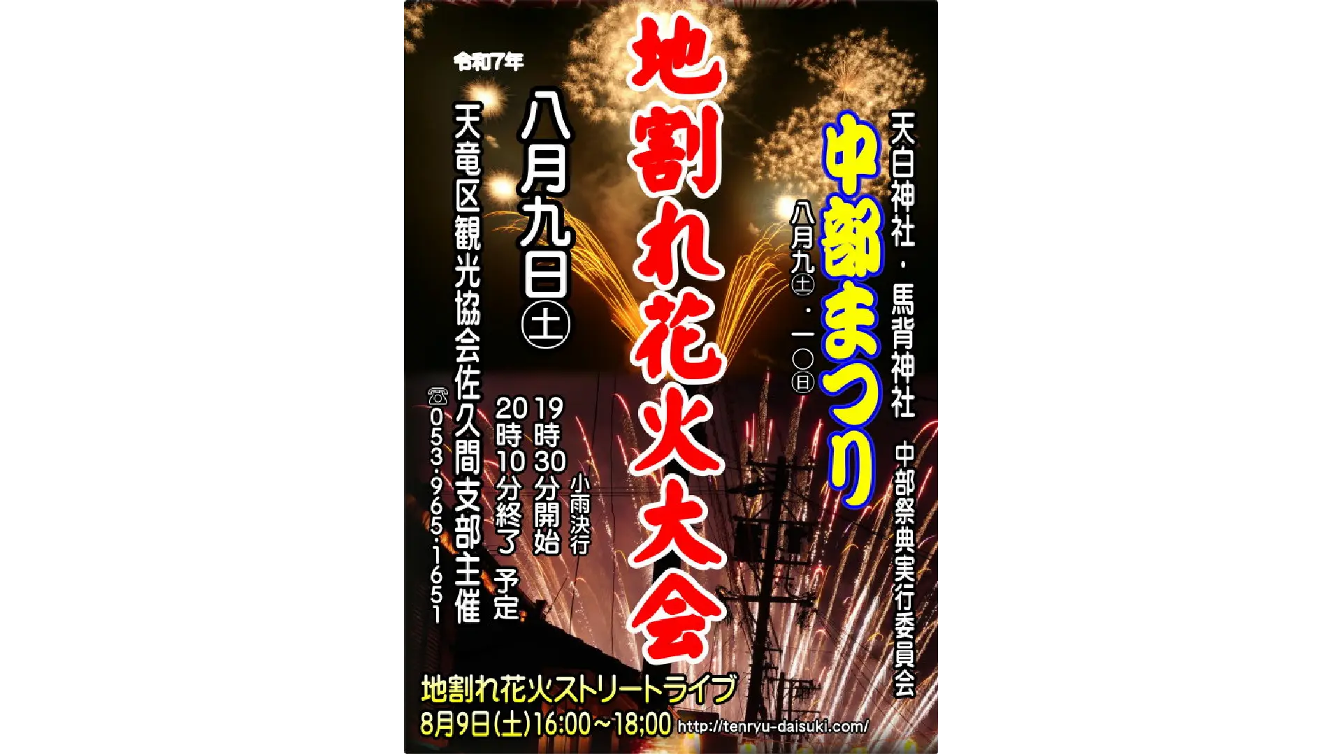 JR飯田線中部天竜駅より徒歩約10分。花火終了後の電車時刻は上り下りとも中部天竜駅を21時発となっておりますので電車もご利用いただけます。