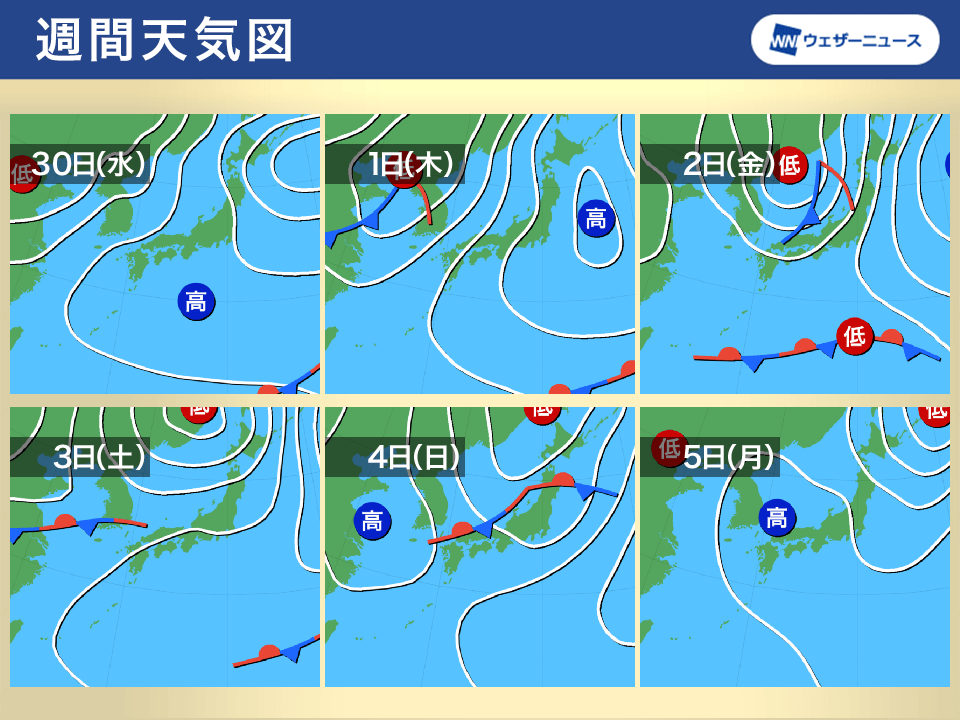 2日(金)以降は日本付近を短い周期で低気圧や前線が通過するため、スッキリしない天気となることが多くなります。日本海側では雨の降ることがあるため、旅行などは雨具を持ってお出かけください。太平洋側も雲が広がりやすく、雨の降る可能性があります。お出かけなどを予定されている方は最新の天気予報をご確認ください。