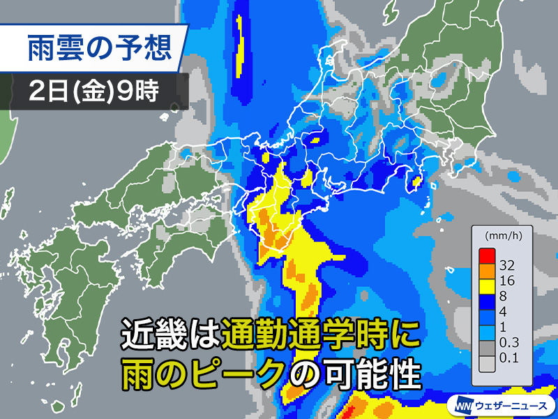 近畿は朝の通勤・通学時間帯と雨のピークが重なる可能性があります。少し早めに準備をするのが良さそうです。