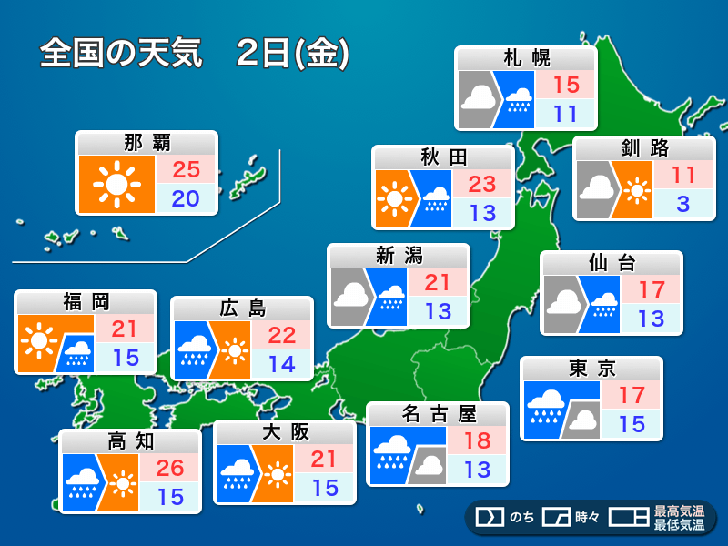 北海道も道南や道央では夜になると雨が降り出す見通しで、お帰りの時間に備えて傘をご用意ください。