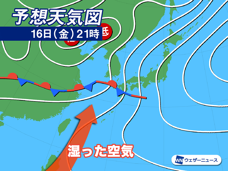 明日16日(金)は晴天をもたらした移動性高気圧が本州東の海上に離れ、大陸から前線が接近。夜には九州を通過する見込みです。