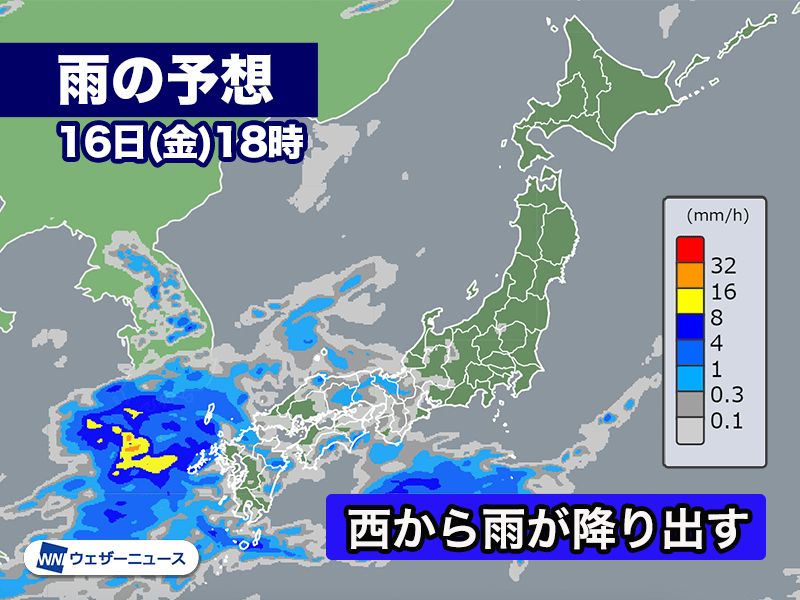前線に近い対馬や五島列島では午前中から雨が降りやすく、午後になると九州の広範囲、中四国の一部でも雨が降り出します。夜には近畿や東海の一部でも雨が降り出す見込みです。出かけるときに雨が降っていなくても傘を忘れずにお出かけください。
