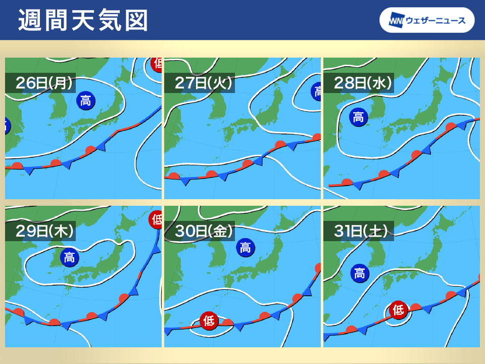 この先一週間は太平洋高気圧の勢力が弱まり、前線の南下とともに日本付近への暖気の流れ込みが弱まるため、暑さは控えめな状態が続きます。