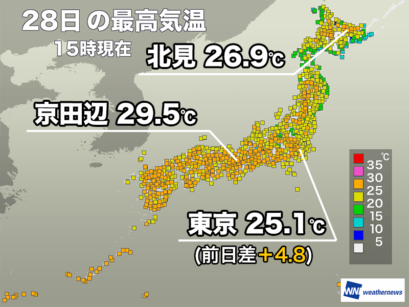 15時までの最高気温が全国で最も高くなった京都府京田辺市では29.5℃と真夏日に迫る暑さです。そのほか、大阪市では28.1℃、名古屋市では27.7℃を観測しました。東京都心は昨日より5℃ほど高い25.1℃まで上がって、6日ぶりの夏日になっています。