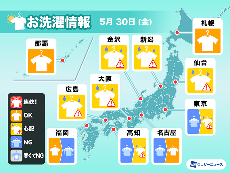 西日本では朝に雨の降っていないところもありますが、再び雨の降り出す可能性があるので油断はできません。外出する場合は部屋干しが安心です。