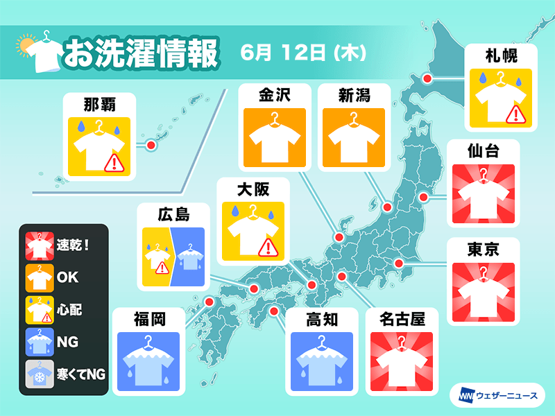 西日本は今日も雨が降るため、外干しはせず、部屋干しやコインランドリーの活用をおすすめします。