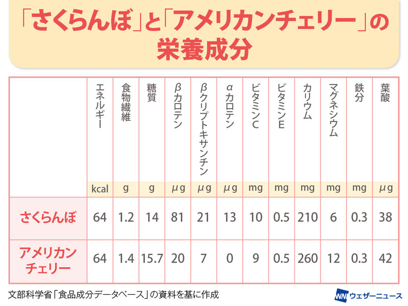 「さくらんぼ」と「アメリカンチェリー」の栄養成分