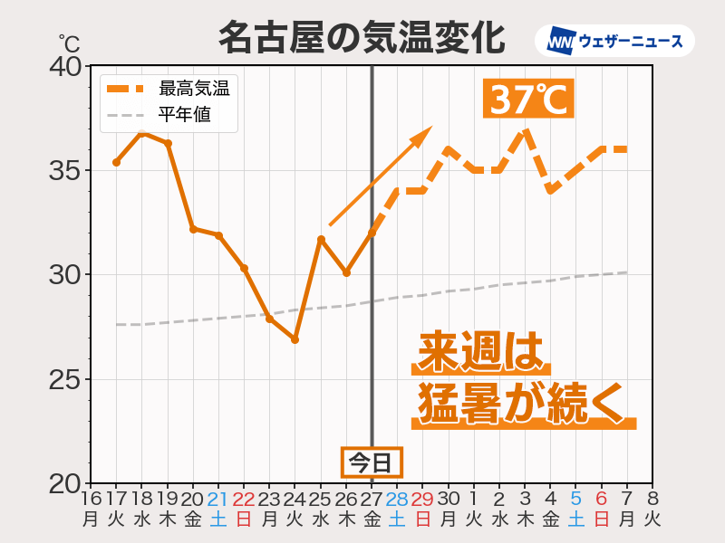 来週になると夜も気温があまり下がらず、疲労や睡眠不足によっても熱中症のリスクが高まる可能性があります。こまめな水分補給やエアコンの使用等で積極的に熱中症予防を行ってください。