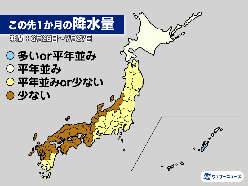 また、気象庁が発表した1か月予報の資料を見ると、1か月を通してみても西日本を中心に降水量が少ない予想となっています。