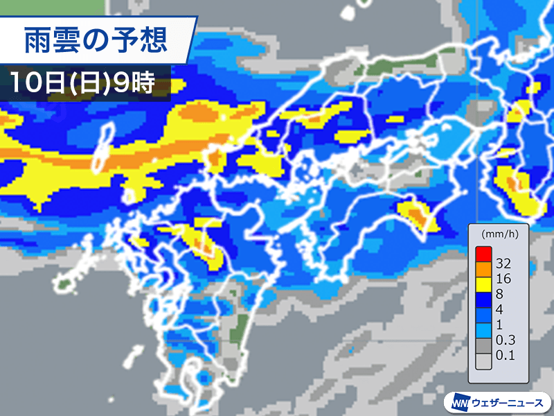 今夜から明日10日(日)にかけてこの発達した雨雲が九州北部や山口県に流れ込み、激しい雷雨となるおそれがあります。また前線上の低気圧も黄海を経由して九州北部や山陰エリアに接近する予想です。九州北部や中国西部では線状降水帯が解析されて局地的に猛烈な雨の降る可能性があります。