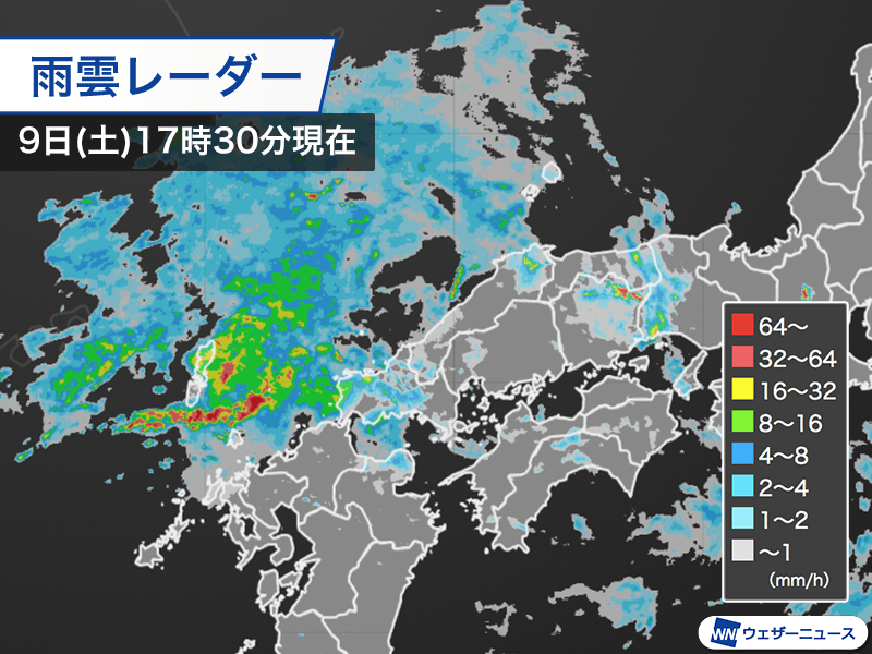 長崎県壱岐島の芦辺のアメダスでは1時間に28.5mm(14:00まで)の強い雨を観測。対馬厳原のアメダスでも21.0mm(16:40まで)の強い雨を観測しました。周辺では発雷も検知されています。