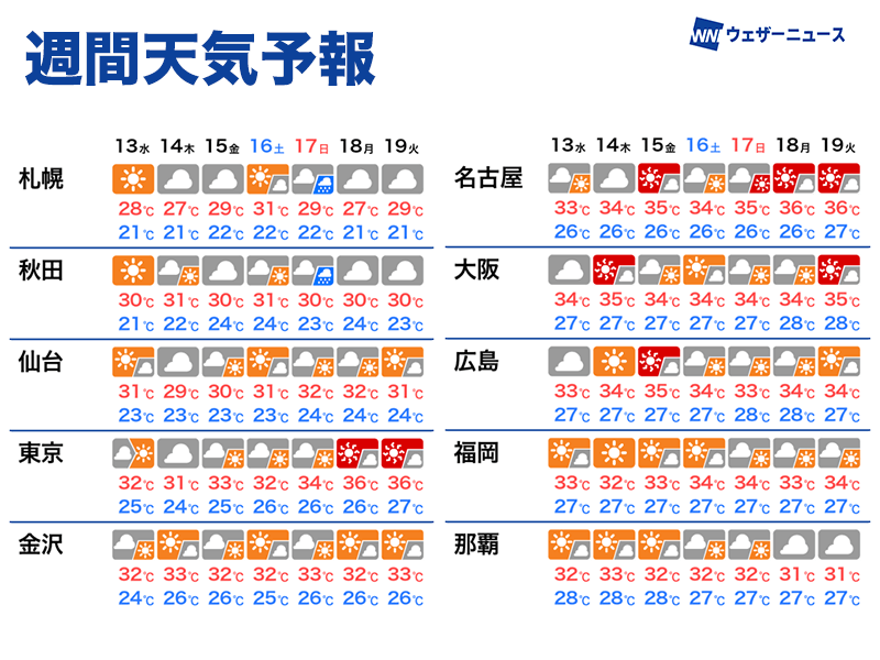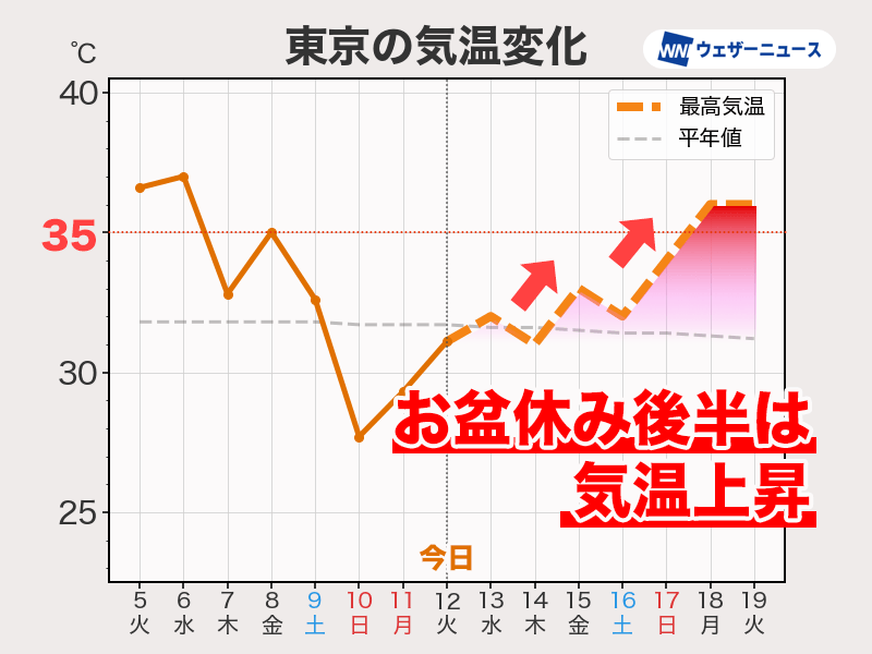 日差しが増えることで気温も上昇し、西日本から東北の広い範囲で30℃を上回ります。8月はじめ頃のような40℃前後に達する危険な暑さにはならないものの、35℃以上の猛暑日となる地点も増えてきそうです。