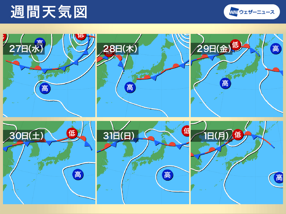 今週前半や月末頃は太平洋高気圧の勢力が強く、西日本から東日本で日差しが届く見込みです。