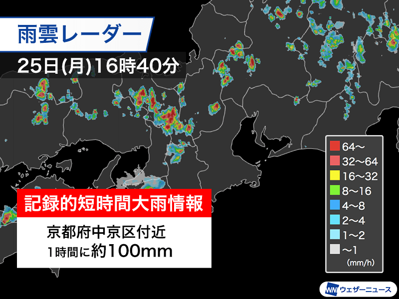 京都府で1時間に約100mmの猛烈な雨 記録的短時間大雨情報