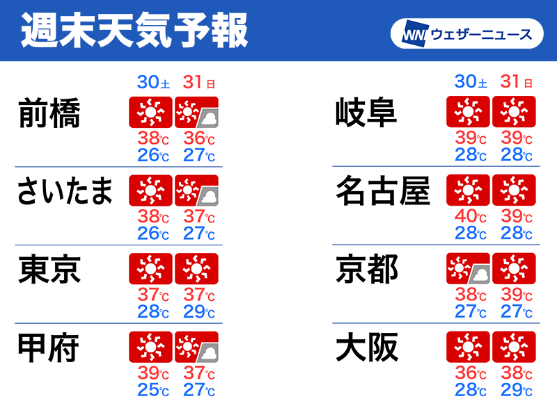 今週末は関東から近畿で危険な猛暑 40℃を超える可能性も