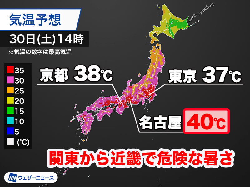 明日30日(土)の最高気温は、名古屋市で40℃の予想です。甲府市や岐阜市が39℃、京都市や前橋市で38℃、東京都心で37℃、大阪市は36℃まで上がる見込みです。