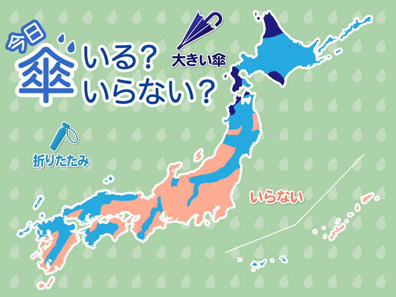 北日本や山陰、九州北部では湿った空気が流れ込むため天気が変わりやすく、急な強い雨や雷雨の可能性があります。家を出る時に雨が降っていなくても外出には折りたたみ傘をお持ちください。