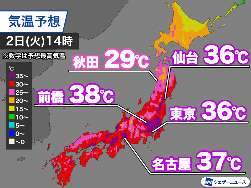 予想最高気温は、東京や大阪で36℃、名古屋や京都で37℃、前橋などで38℃となっています。