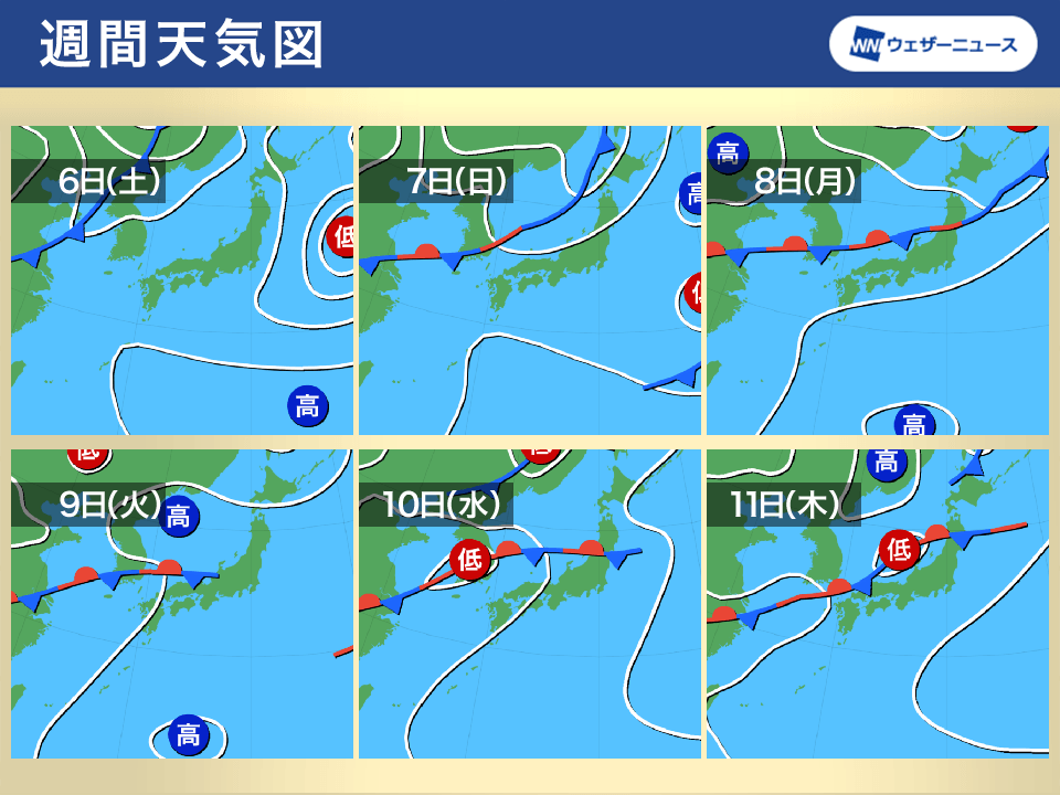 前線の影響を受けづらい西日本太平洋側を中心に日差しの届く日が多いと見ているものの、この前線の活動度合いや位置次第で、各地の天気が左右されそうです。雨の降る可能性もあるため、こまめに週間予報の変化をご確認ください。