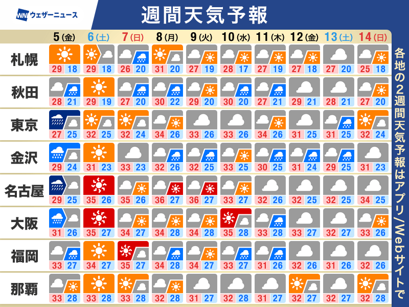 週末になると天気が回復し、再び気温が高くなります。来週も日差しが届くところで35℃以上の猛暑日となるところもあり、真夏の暑さが復活しますので熱中症に警戒してください。