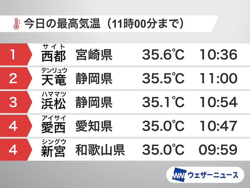 11時時点で35℃以上を観測した猛暑日地点は東海で3地点、近畿と九州でそれぞれ1地点の合計5地点です。