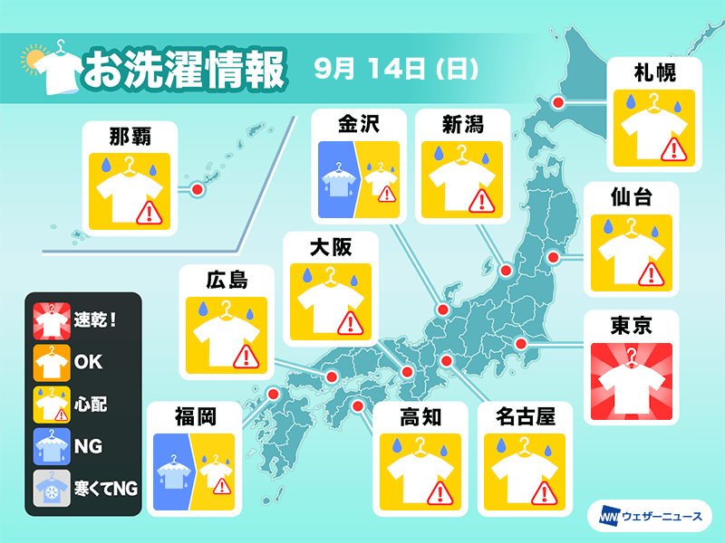 東日本から西日本は雲が多く、日差しが届いても、にわか雨や急な雷雨の可能性があります。部屋干しや乾燥機、コインランドリーなどの活用をおすすめします。