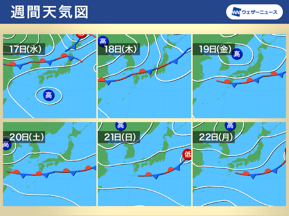 19日(金)以降は、秋雨前線が本州の南岸に停滞するため、西日本や東日本ではスッキリしない天気が続きます。