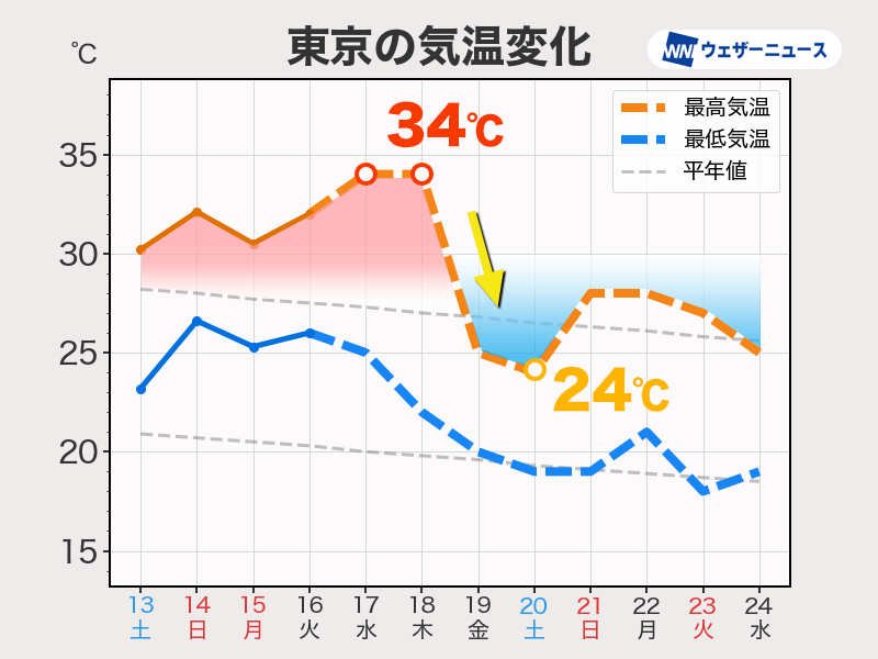 秋雨前線が南下した19日(金)以降は、厳しい残暑が落ち着く見通しです。関東では北東からの風が吹き、昼間でも30℃に届かないところが多くなります。最低気温も20℃を下回る日が多くなりそうです。