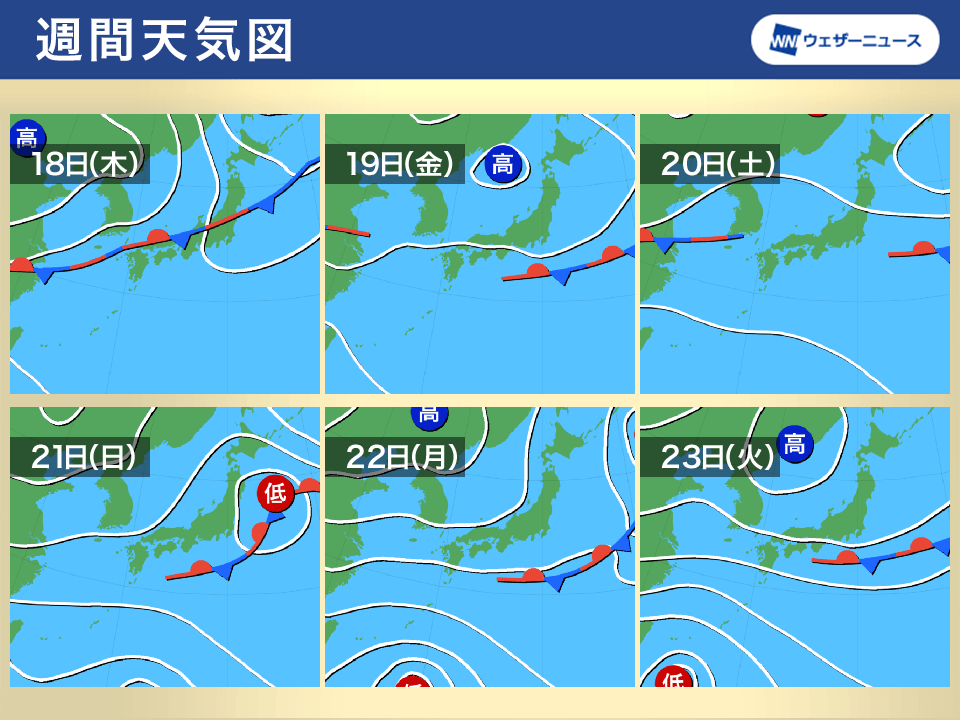 19日(金)以降は、秋雨前線が本州南岸付近に停滞するため、西日本や東日本ではスッキリしない天気が続きます。