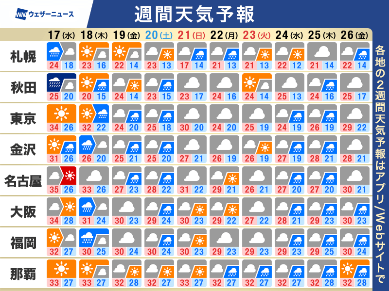 秋雨前線が南下する19日(金)以降は、厳しい残暑が落ち着く見通しです。