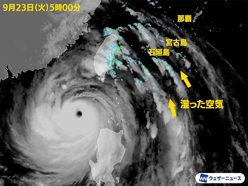 台風18号は次第に沖縄から遠ざかっているものの、西に離れる過程のため湿った空気が流れ込みやすい状況が続いています。先島諸島は断続的に雨雲が通過して、ザッと雨が強く降ることがありそうです。晴れる沖縄本島や奄美も、急な雨に注意してください。