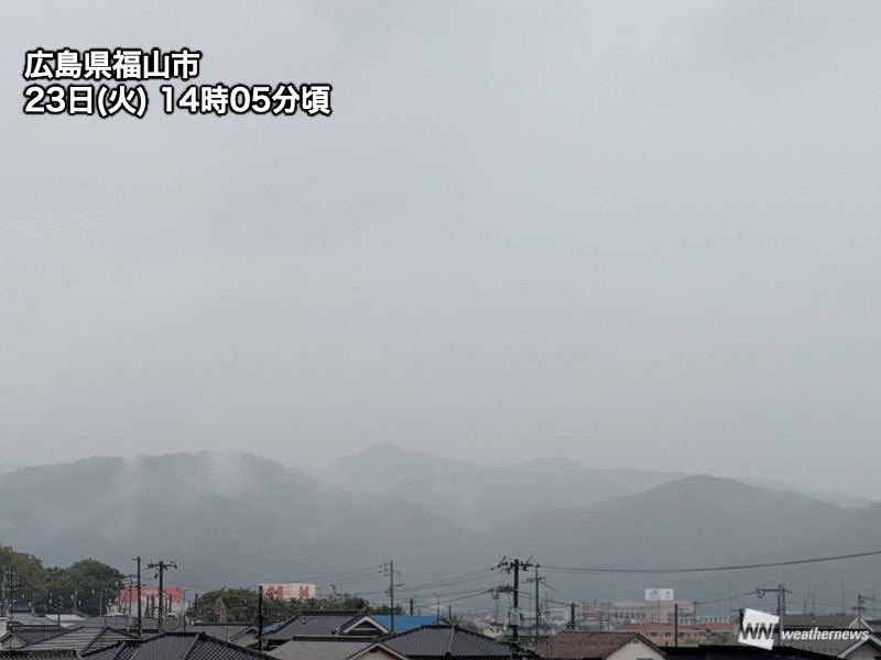 高気圧の縁をまわる湿った空気が西日本に流れ込んでいます。中国・四国付近には前線帯もあり、午前中から雨が降ったり止んだりを繰り返している状況です。雨雲はそれほど発達しておらず、1時間に1mm前後の雨の所が多くなっています。