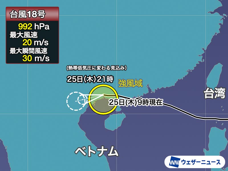 今日25日(木)の夜にはベトナム付近で熱帯低気圧に変わる予想です。