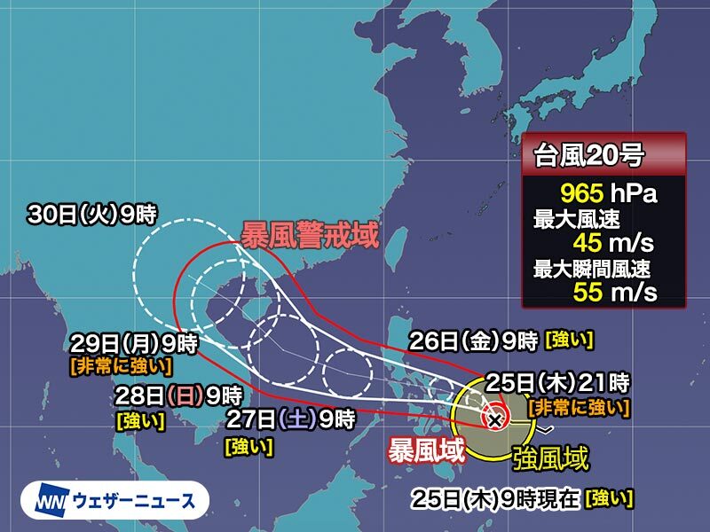 強い台風20号は発達しながらフィリピンの東の海上を西に進んでいます。強い勢力と暴風域を維持してフィリピンに接近、通過する予想で、進路に近いエリアでは荒天に見舞われるおそれがあります。