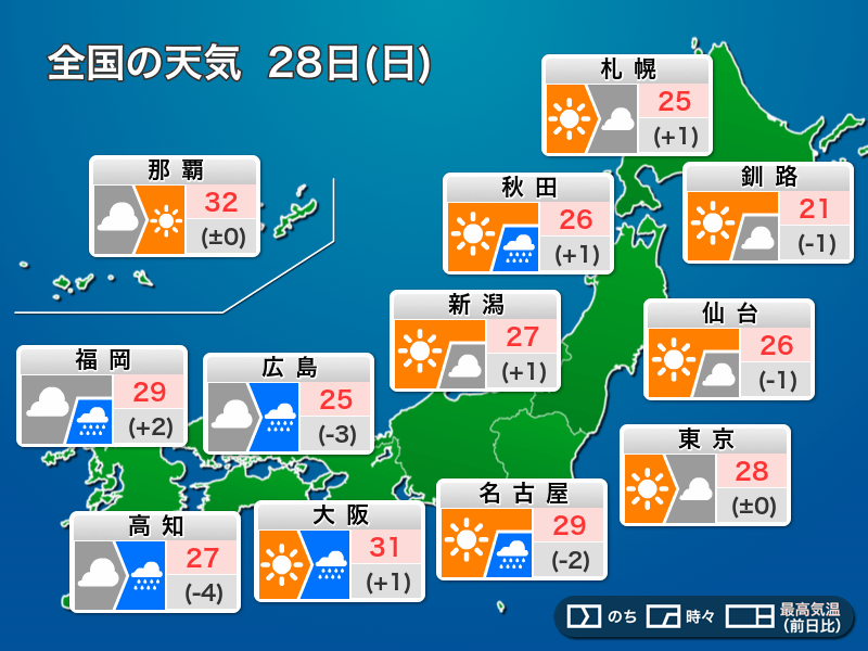 所々でにわか雨の可能性があるため、お出かけの際は折りたたみの傘など雨具をご用意ください。