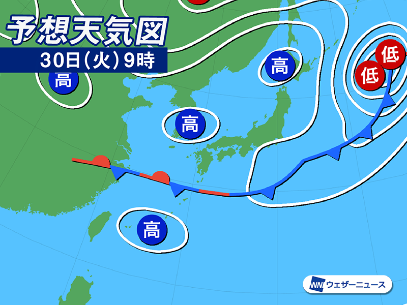 前線の南側となる沖縄は青空が広がります。最高気温は30℃を超え、朝晩も蒸し暑く感じられそうです。一日を通して熱中症に注意が必要です。