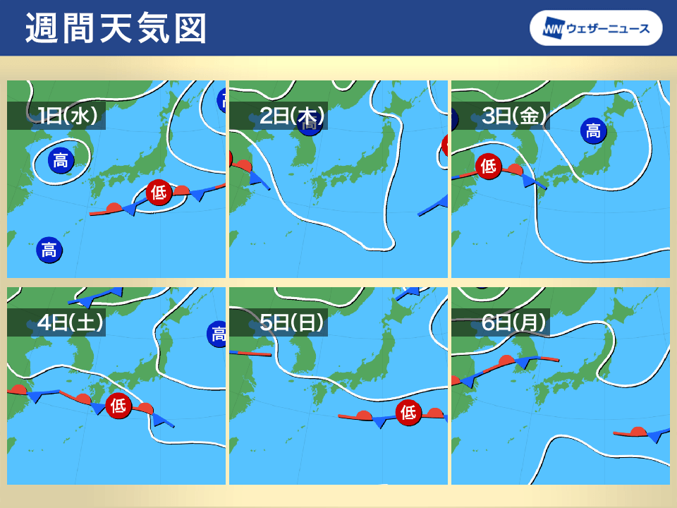 週後半からは大陸方面から低気圧と前線が接近します。3日(金)は西日本で、4日(土)は東日本から西日本の太平洋側で雨が降る予想です。