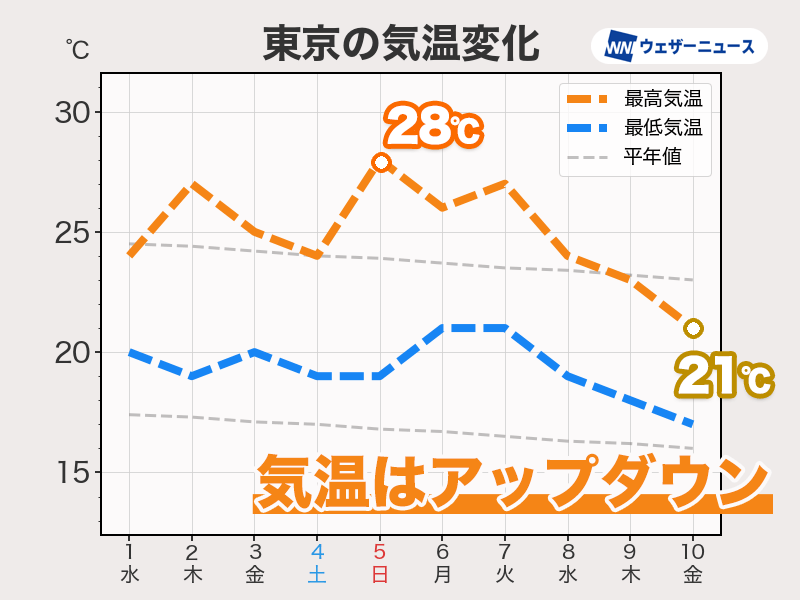 一方、朝晩は20℃前後まで下がり、日中との気温差が大きくなります。日ごとの気温変化に加え、朝晩と日中の気温差も大きくなり、体調を崩しやすい時期ですので、服装選びなどにお気をつけて、体調管理をしっかりと行ってください。