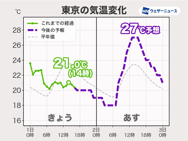 天気が回復することで昼間は気温が上昇し、関東や東北南部では25℃を大きく上回る見込みです。今日1日(水)に比べると大幅に高く、日差しの下では少し暑く感じるくらいになります。