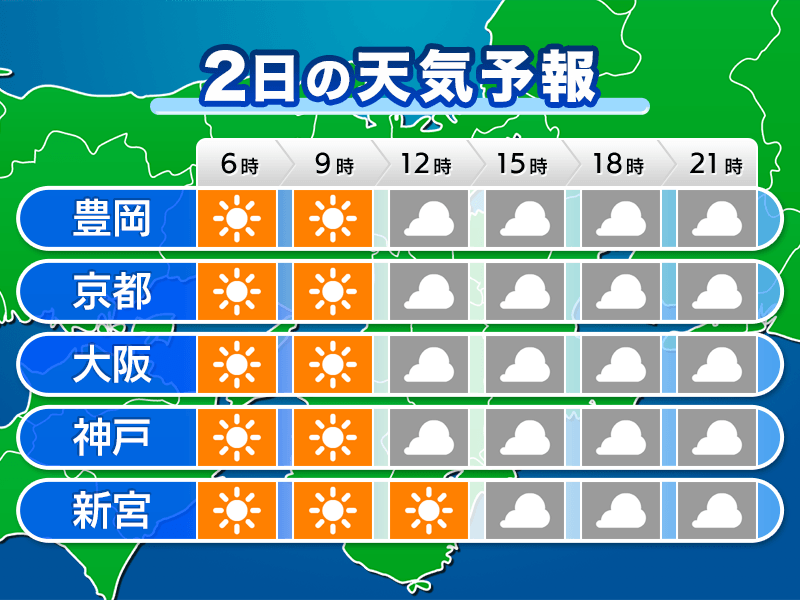 西日本は午前中を中心に晴れる所が多くなります。午後は段々と雲が広がり、ゆっくりと天気は下り坂となる見込みです。