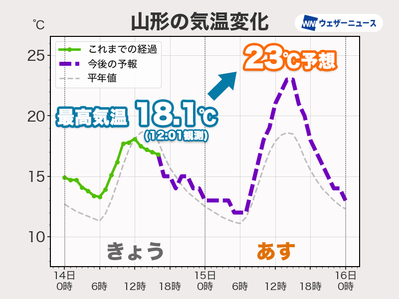 今日14日(火)に比べると若干低めではあるものの、10月らしくない暑さになります。