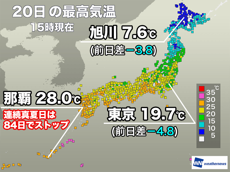 北日本や関東は気温上がらず 那覇の連続真夏日は84日でストップ