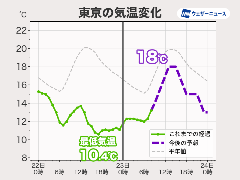 昨日の関東は雨で午後に気温が下がり、東京都心の最低気温10.4℃は16時半すぎに観測しました。昨夜から今朝にかけては気温がほぼ横ばいで、今日23日(木)の最低気温は1時37分に観測した11.5℃です。