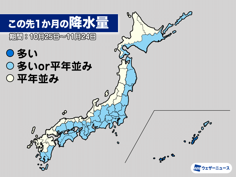 1か月の降水量は平年並みか平年よりも多い予想となっています。秋晴れが貴重になるかもしれません。