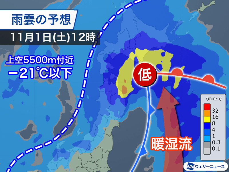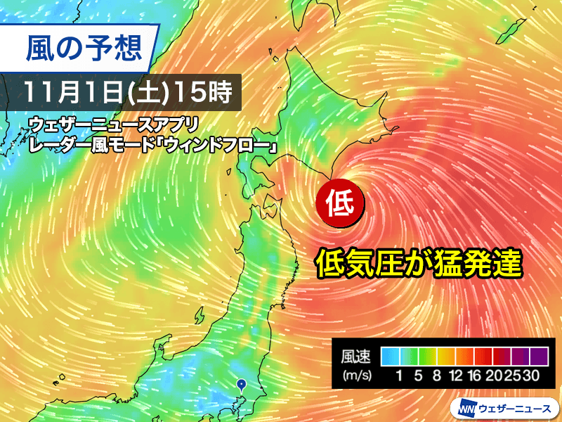 大陸から上空5500m付近で−21℃以下の寒気が南下してくるため、低気圧は三連休初日となる11月1日(土)にかけてさらに発達するとみられます。