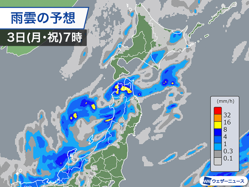 日本海で発生した低気圧が北日本付近を通過し、連休最終日の明日3日(月)・文化の日は北日本の日本海側や北陸を中心に大気の状態が不安定になる見込みです。一時的な強い雨や落雷、アラレや突風に注意が必要です。
