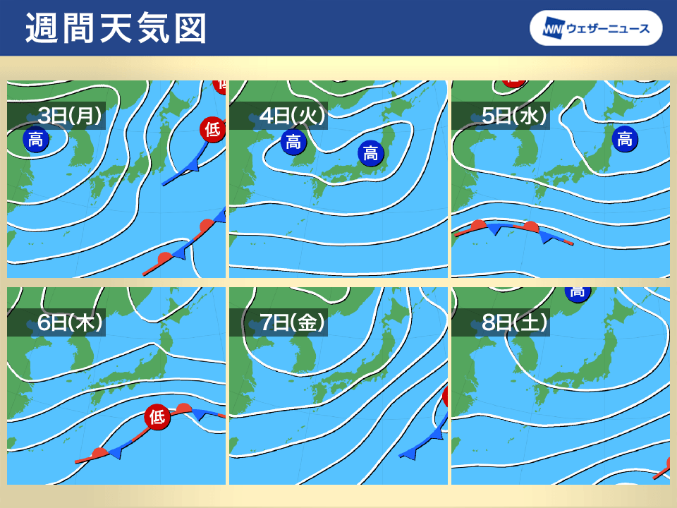 週中頃の5日(水)から6日(木)にかけては、前線が本州の南海上まで北上し、西日本から東日本の太平洋側を中心に雨や曇りとなる予想です。