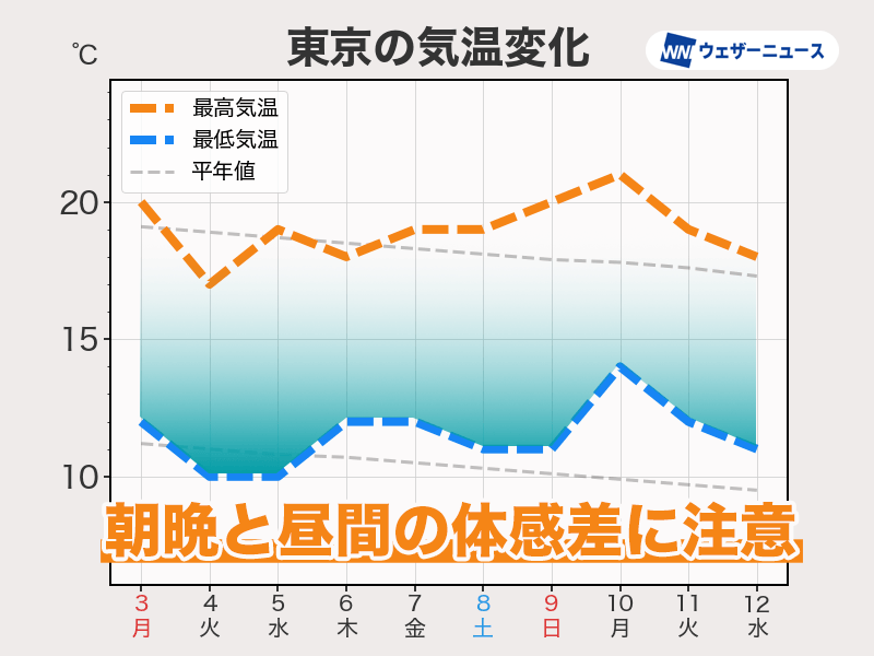 5日(水)以降は、上空の寒気は北に退くため平年並みの気温に戻ります。晴れる日ほど朝晩と昼間の気温差が大きくなりますので、服装選びや体調管理にご注意ください。