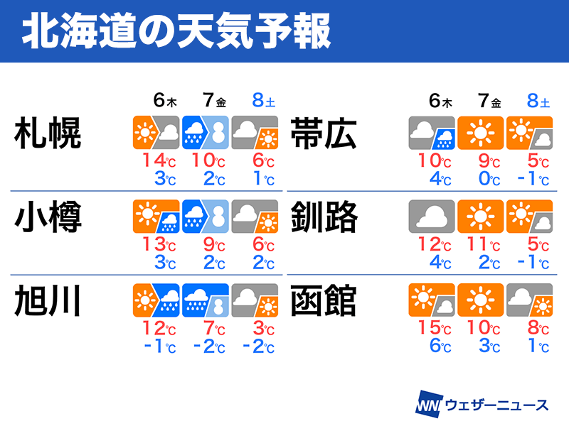 明日の北海道は天気下り坂 7日(金)は寒気南下で雪に