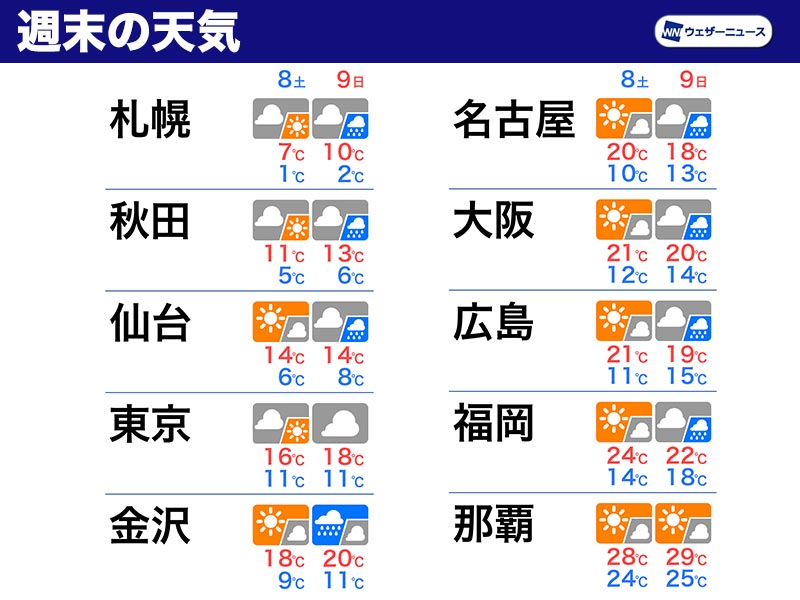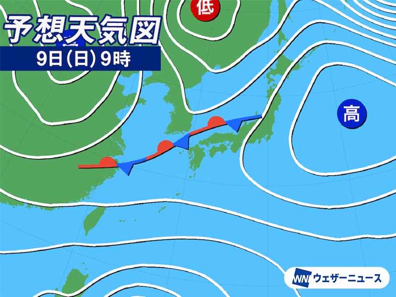 9日(日)は前線通過で広く雨に